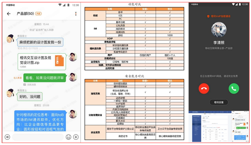 主要功能:即时通信、加密通话、文件传输、工作群组、组织通讯录、组织管理、全终端互联。